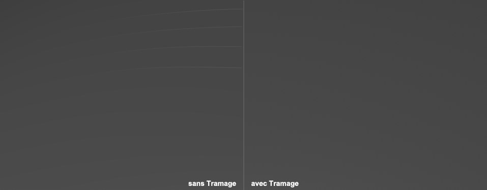 Des regroupements peuvent arriver quand vous avez des gradations progressives dans la luminosité (dans l’exemple ci-dessus, cela arrive sur la transition de RVB 69, 69, 69 à RVB 70, 70, 70). Un Tramage peut résoudre visuellement les transitions de couleurs fortes.