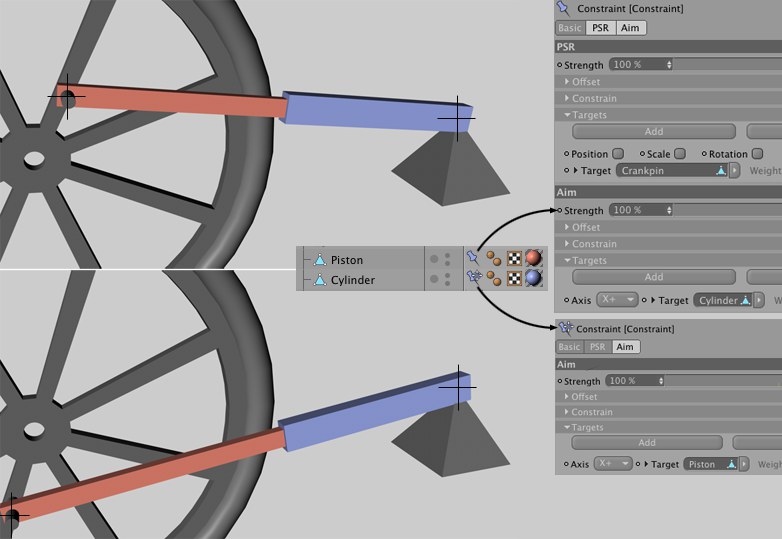 - Une contrainte Cible qui influe sur l’angle du piston et qui doit être directement alignée avec le point de rotation du cylindre