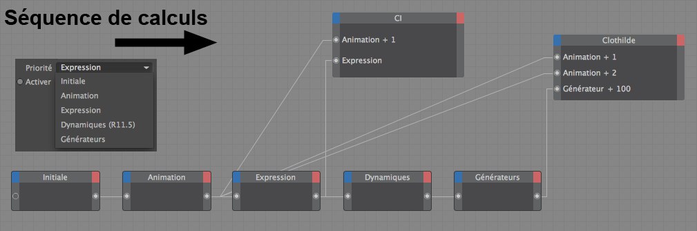 Séquence de calculs des différentes fonctions. Les priorités internes de certaines fonctions sont également affichées.La dynamique (par exemple, priorité Générateur +400) définit ces priorités en interne. Il est impossible de les modifier. Par exemple, les expressions pointant vers un objet déformé par la dynamique nécessitent une priorité d'au moins Générateur +401.