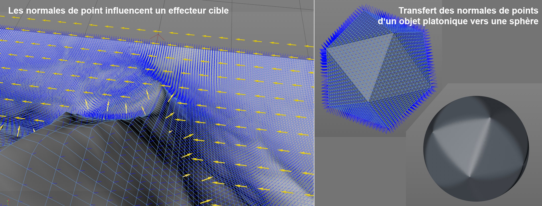 À gauche, la propriété Normale de point dans un Effecteur cible, à droite dans une autre propriété Normale de point (le corps et la sphère platoniciens doivent être concordants).