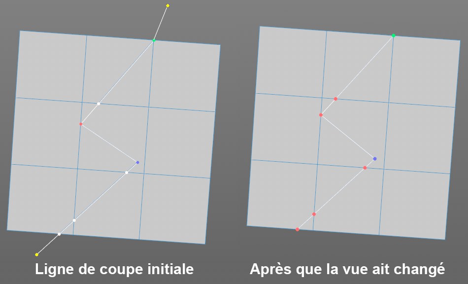 La ligne de coupe est projetée sur l'objet qui doit être coupé en fonction de l'angle de la vue. Vous pouvez la magnétiser à des polygones, des arêtes et des points ou la laisser libre dans l'espace.