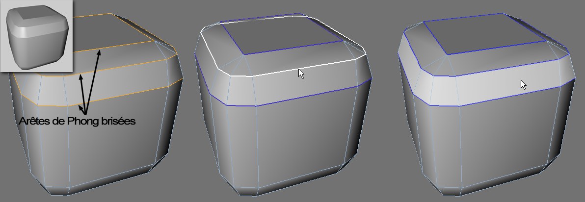 Cet outil est particulièrement utile pour un travail avec des objets mécaniques en basse résolution dont les Arêtes ont été affectées via un ombrage avec Arêtes de limitation. Il est possible de sélectionner très facilement les Arêtes et Polygones de limitation d'ombrage. Les Arêtes de limitation d'ombrage seront affichées en surbrillance. Cet outil recherche et affiche automatiquement les Arêtes associées. En mode Polygone, les polygones associés se trouvant dans une zone de lissage seront sélectionnés.