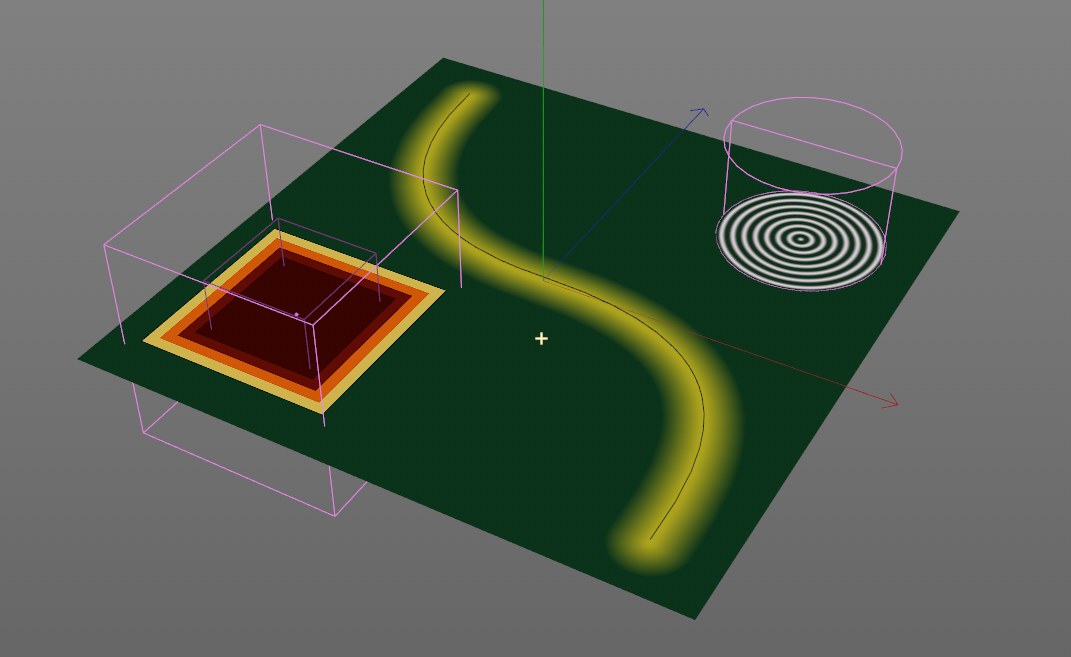 Elle peut aussi être contrôlée à l’aide des Champs, par ex. vous pouvez créer des effets de texture paramétriques simples à l’aide des Champs (mais uniquement via les points d’objet colorés) :