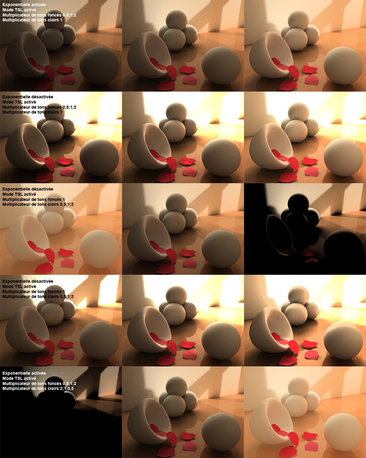 La même scène avec différentes options activées et différentes valeurs pour ces options.
