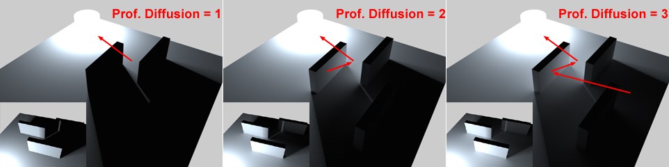 La Profondeur de Diffusion (qui ne peut être défini qu’avec le Cache d’Irradiance ou le QMC comme Méthodes Secondaires) détermine la fréquence avec laquelle une lumière doit être reflétée depuis une surface (notez la différence entre des lumières polygonales et des lumières « réelles », comme décrit ici).