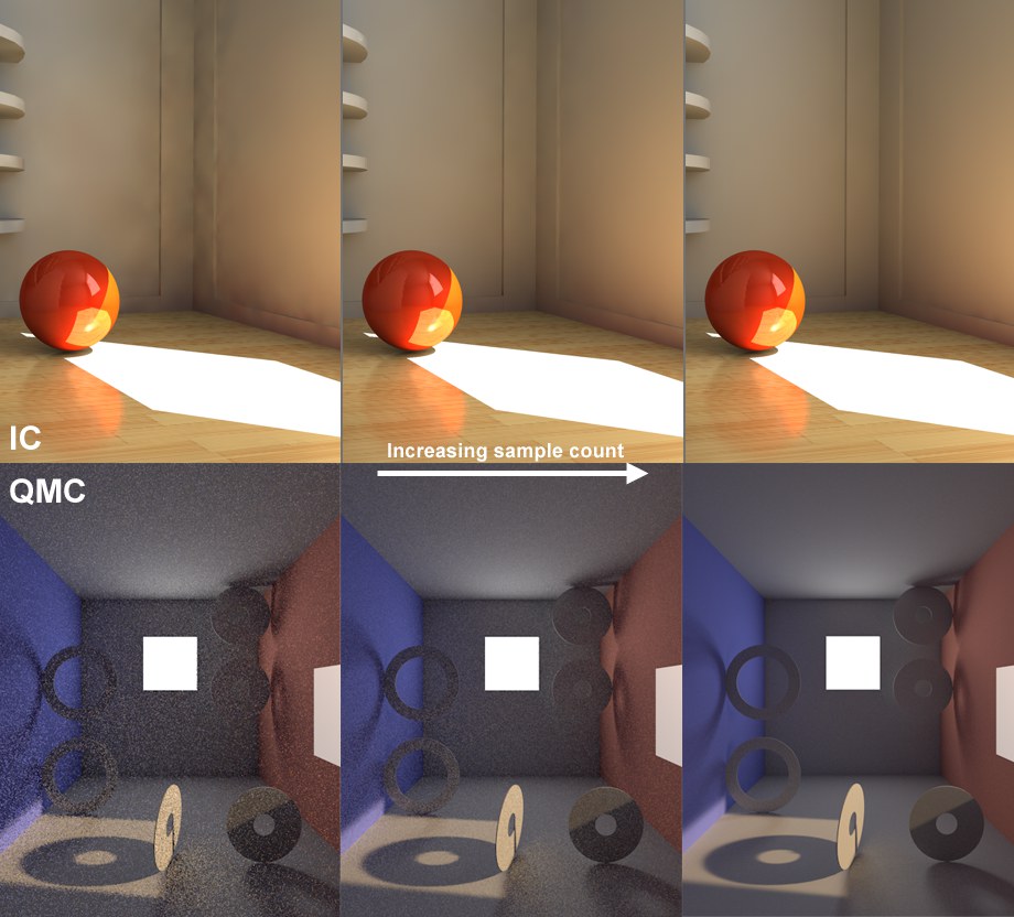 Pourquoi ces deux méthodes sont-elles séparées ? Simplement parce que la méthode primaire est la plus importante pour la qualité du rendu, et elle nécessite donc l’utilisation de méthodes de haute qualité comme le QMC et l’IR. Bien évidemment ces méthodes prennent plus de temps à être calculées. Pour les rebonds de lumière, des méthodes plus rapides peuvent être utilisées comme la Radiosité ou le Placage de lumière.