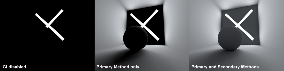 - La Méthode Secondaire calcule la luminosité des surfaces (qui n’ont pas besoin d’être directement dans le champ de la caméra) éclairées par de multiples réflexions lumineuses.
