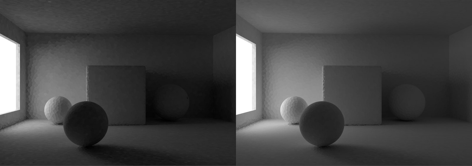 Dans cet exemple, seule la Méthode Primaire a été utilisée sur la partie gauche de l’image, et les Méthodes Primaires et Secondaires ont été utilisées sur la partie droite ; avec à gauche, une lumière polygonale. À droite, une lumière normale.
