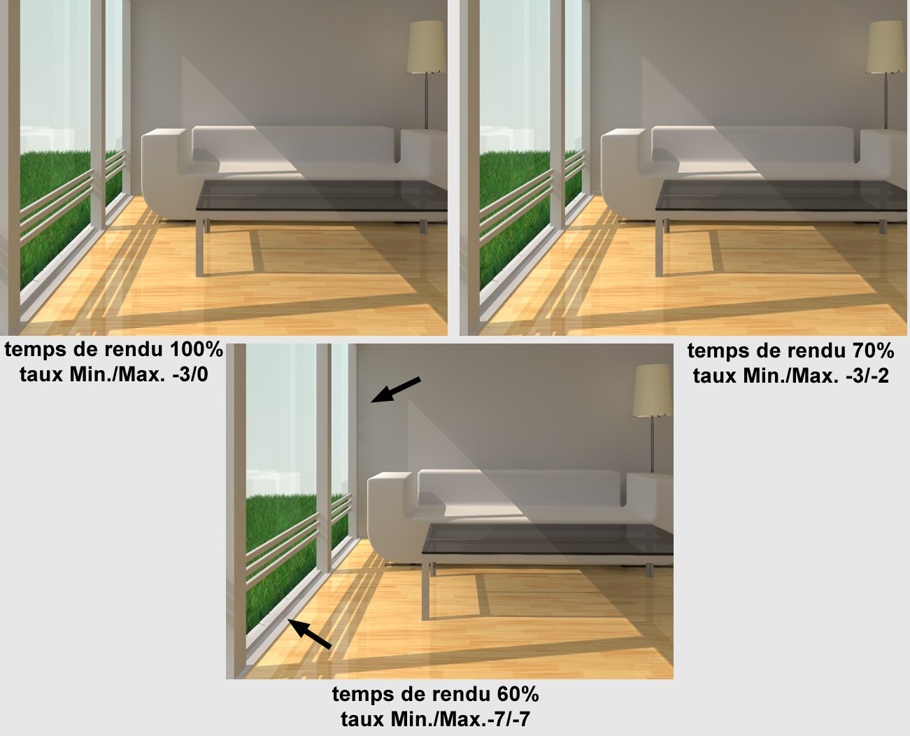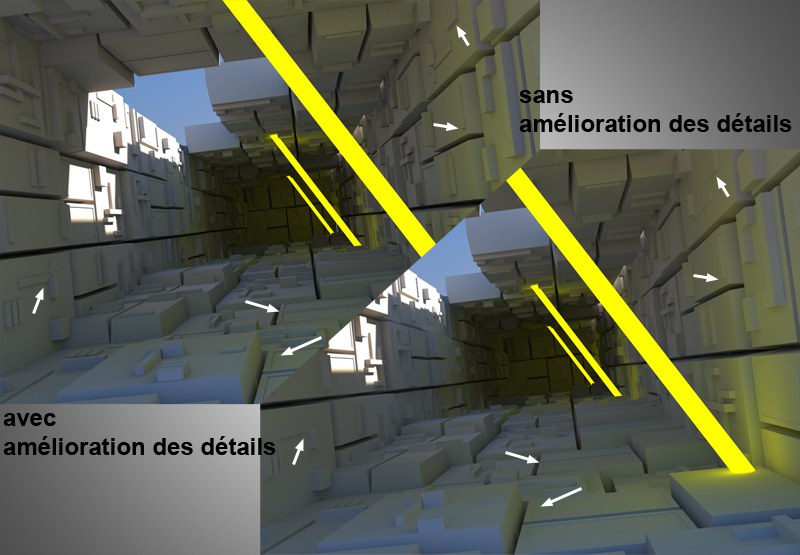 Si vous appliquez l’amélioration des détails vous pouvez diminuer les autre paramètres du cache d’irradiance (en particulier ceux concernant la densité d’enregistrements).