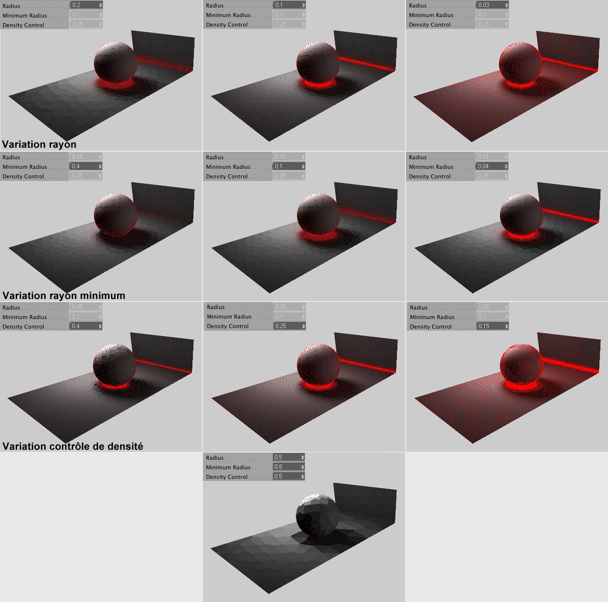 Variation des paramètres Rayon, Rayon Minimum et Contrôle de densité. L’option Utiliser correction de proximité est désactivée (elle crée des shading points supplémentaires). Dans notre exemple, les shading points ont été coloriés en rouge pour une meilleure visibilité.