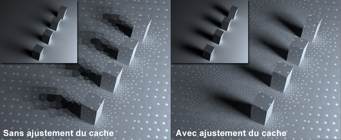 C’est là que le paramètre Ajustement Cache entre en jeu: il compare les Enregistrements du cache Irradiance (c’est-à-dire les shading points) et en crée dans les zones où le contraste est fort (brillance et couleur) afin d’améliorer ces zones et d’en faire un rendu plus précis.