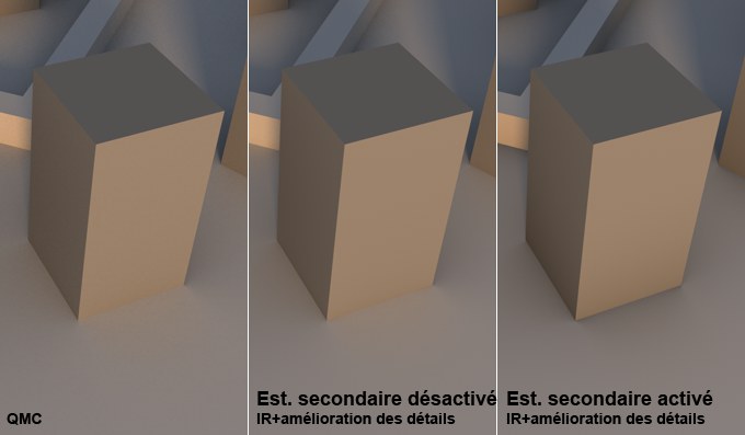 Au centre, estimation secondaire désactivée, à droite activée. A gauche un rendu QMC pour comparaison. Notez la façon dont les zones de contact de l'objet ont été obscurcies sur l'image à droite.