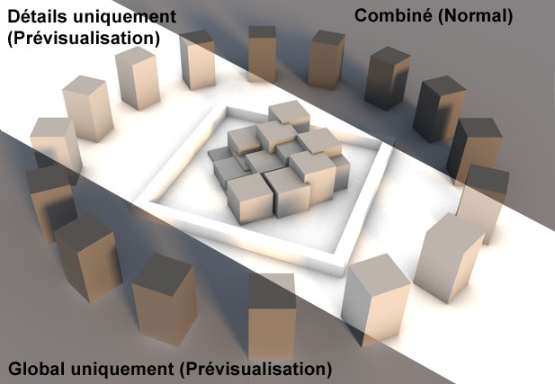 Les détails les plus subtils relatifs à l’ombre et à la lumière peuvent être omis en raison de l’interpolation entre un nombre limité de shading points. C’est sur ce point que la méthode QMC a un avantage. Mais la méthode IR propose une option Amélioration des détails qui combine les méthodes QMC et IR afin de compenser cet inconvénient. La méthode IR propose également de nombreux paramètres supplémentaires qui vous permttront de maximiser les capacités de rendu pour chaque scène.