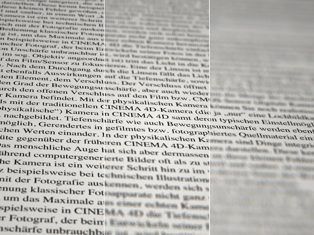 Dans Cinema 4D, la profondeur de champ pour l’angle de vue de la caméra est définie via la Distance de mise au point, qui peut être modifiée dans l’Editeur: