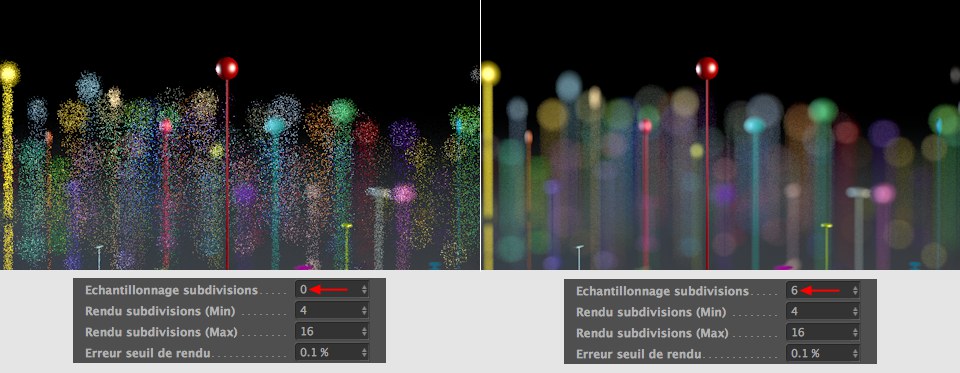 Les résultats du rendu avec les valeurs montrées pour Subdivisions échantillonnage.