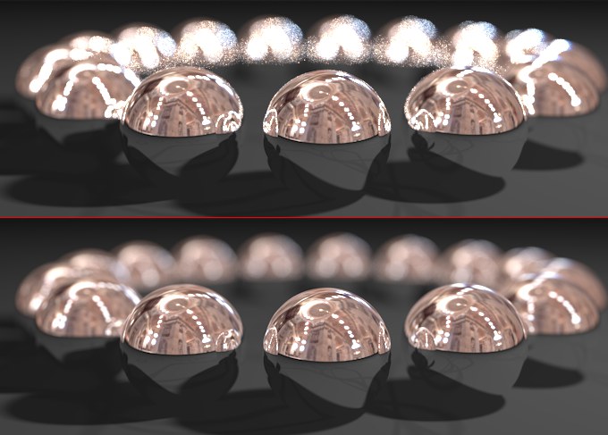 Si vous laissez charger le rendu d'une scène indéfiniment, vous pouvez atteindre une image parfaite, complètement homogène. Cependant, il est possible d'obtenir de très bons résultats bien avant l'infini. Il est tout de même possible que le temps de rendu soit aussi long qu'avec d'autres modes dans certaines circonstances.