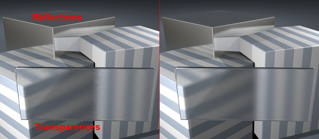 Un plus grand nombre d'échantillons (droite) donne une meilleure qualité aux réflexions floues et aux transparences.