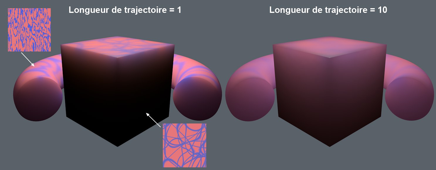 Plus la valeur est basse, plus le temps de rendu est long. C’est parce que plus la longueur trajectoire est courte, plus il y a d’échantillons à calculer. Pour les animations, les valeurs seront en partie mises en cache, ce qui fait que la première image mettra beaucoup plus de temps à être chargée pour l’animation que les suivantes.