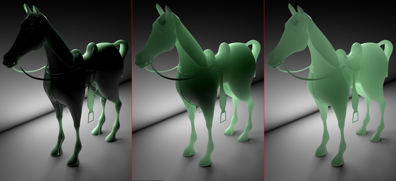 De gauche à droite, des valeurs Longueur trajectoire de plus en plus élevées (1cm, 7cm, 20cm par 300cm longueur trajectoire) et des temps de rendu de plus en plus courts. La scène 2 est illuminée par 2 éclairages de surface venant de la gauche du cheval.