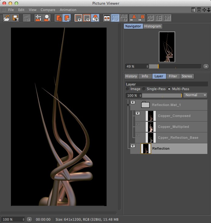 En plus du calque Réflexion (qui combine toutes les réflexions), le dossier Reflection_Mat_1 comprent également 3 calques. Si ce dossier est rendu visible en cliquant sur l’icône en forme d’oeil, le calque Cuivre_combiné - et seulement ce calque - sera rendu visible. En effet, ce calque est composé des deux calques Cuivre_multiplier et Cuivre_réflexion_base. Si les deux calques restants dans ce dossier sont rendu visibles, deux réflexions actives différentes seraient appliquées.