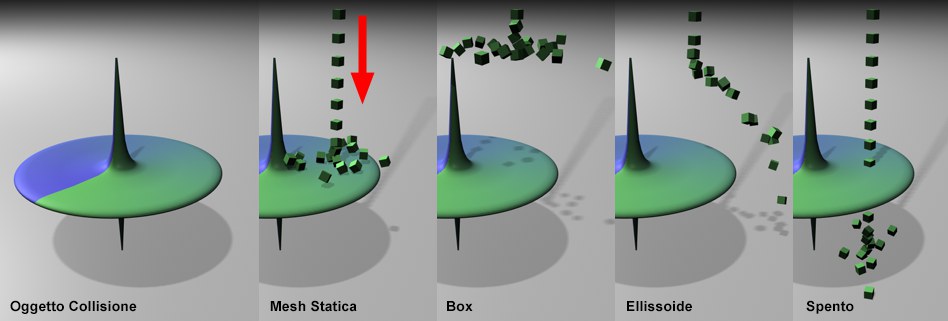 Generalmente parlando, il rilevamento delle collisioni comporta un processo computazionale piuttosto lungo. In cambio però offre dei comportamenti molto realistici: gli oggetti saranno respinti, frenati a causa dell’attrito, ecc. Bisogna anche considerare che più complessa è una forma, più lunghi saranno i tempi di collisione. Questo è il motivo per cui questo menu vi offre alcune forme sostitutive che potete posizionare attorno all’oggetto di collisione. Ciò può farvi risparmiare sui tempi di rendering. In una animazione infatti, spesso è assai difficile distinguere da lontano se quello che viene utilizzato per la collisione è l’oggetto reale o uno sostitutivo. Le forme disponibili si trovano nel menu opzioni Forme Collisioni della tab Collisione.