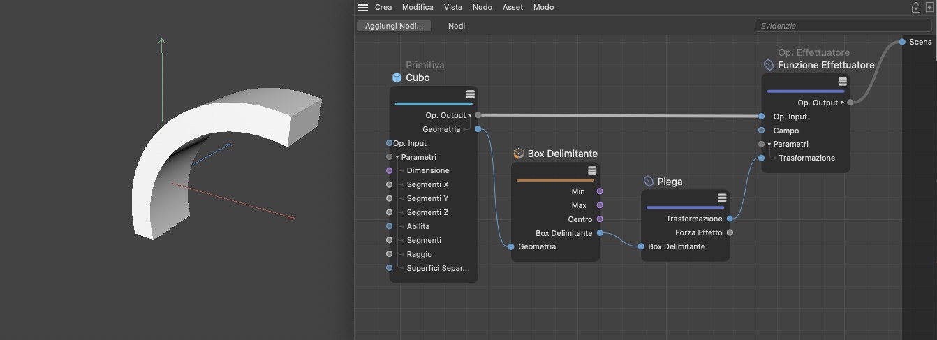 Questo Nodo può essere usato per creare una piegatura. L’effetto è paragonabile a quello del deformatore Piegare.