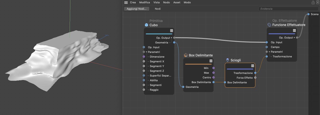 Questo Nodo può essere usato per fondere un oggetto come una palla di cera. Questa funzione riflette quella del deformatore Sciogliere.
