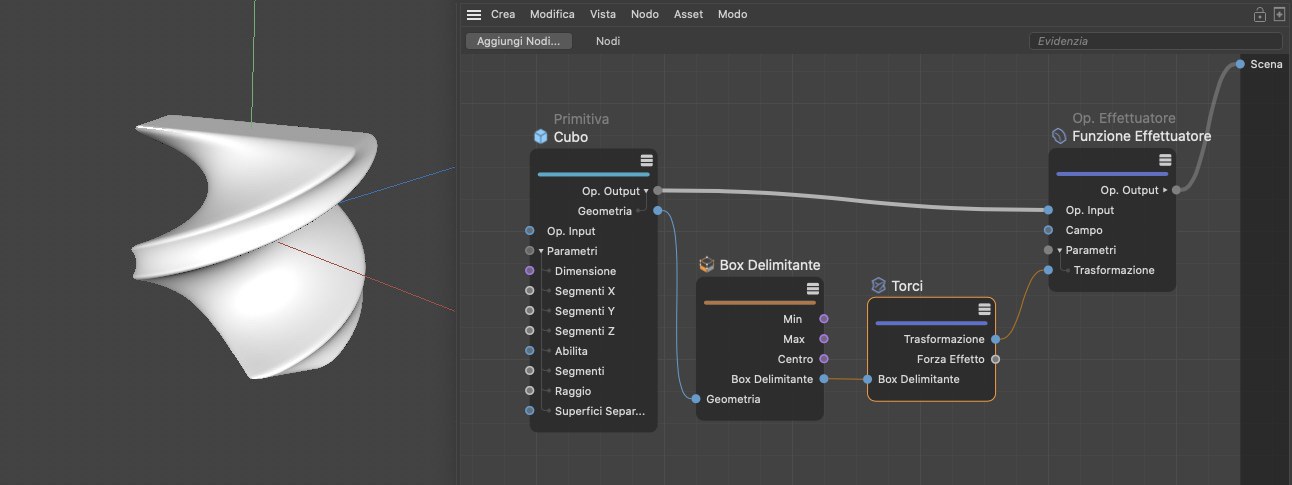 Questo Nodo può essere utilizzato per torcere elementi o punti di una data geometria attorno ad un asse centrale. L'effetto riflette quello del deformatore Torcere.