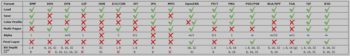 様々な画像フォーマットと属性。マルチページはインポートだけです;複数の入力がある場合、これは読み込みまたは保存に使われます;ビットデプスのiはインデックスカラーです。