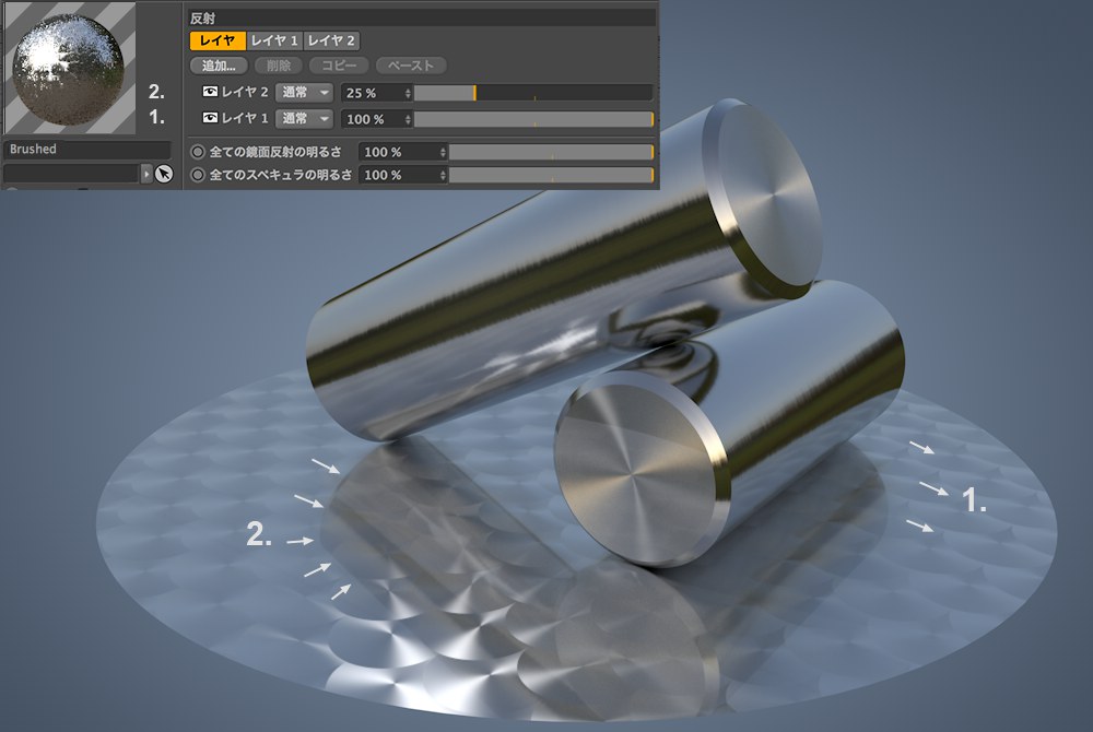 反射強度がレイヤーごとに定義されるレイヤー自体の鏡面反射強度設定と比較して、全ての鏡面反射の明るさ設定は反射全体の強度をコントロールします。例えば、反射強度の異なる反射を複雑に組み合わせた結果、レンダリングした時の反射が全体的に強すぎてしまった場合、このスライダを使って、個々の反射設定を調整することなく全体の反射トーンを下げることができます。
