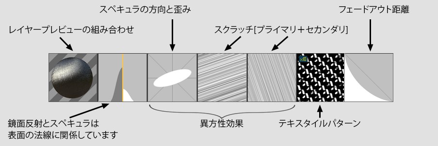 •異方性スペキュラハイライトの歪みと方向を表示します。このプレビュと次の2つのプレビュは、タイプが異方性およびプライマリ+セカンダリのスクラッチにセットされている時にのみ表示されます。