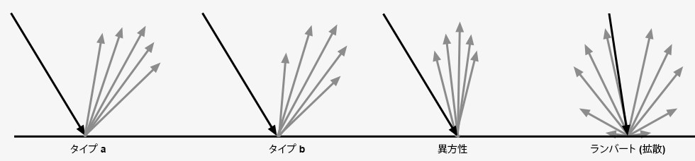 ライトの分散はマット反射に生じる効果です。これらのタイプは、完全な反射をもつサーフェイス(表面粗さを0%にセット)には何の効果ももたらしません。数学的な詳細に立ち入る内容となるため、各タイプについての詳しい説明は避け、説明は短めにしておきます。