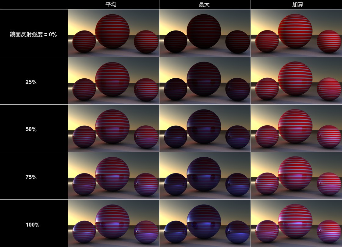 現実の世界では、サーフェイスの反射性が増すにつれてカラーチャンネルによる効果が弱まりますが、加算モードではこのような現象が全て無視されます。