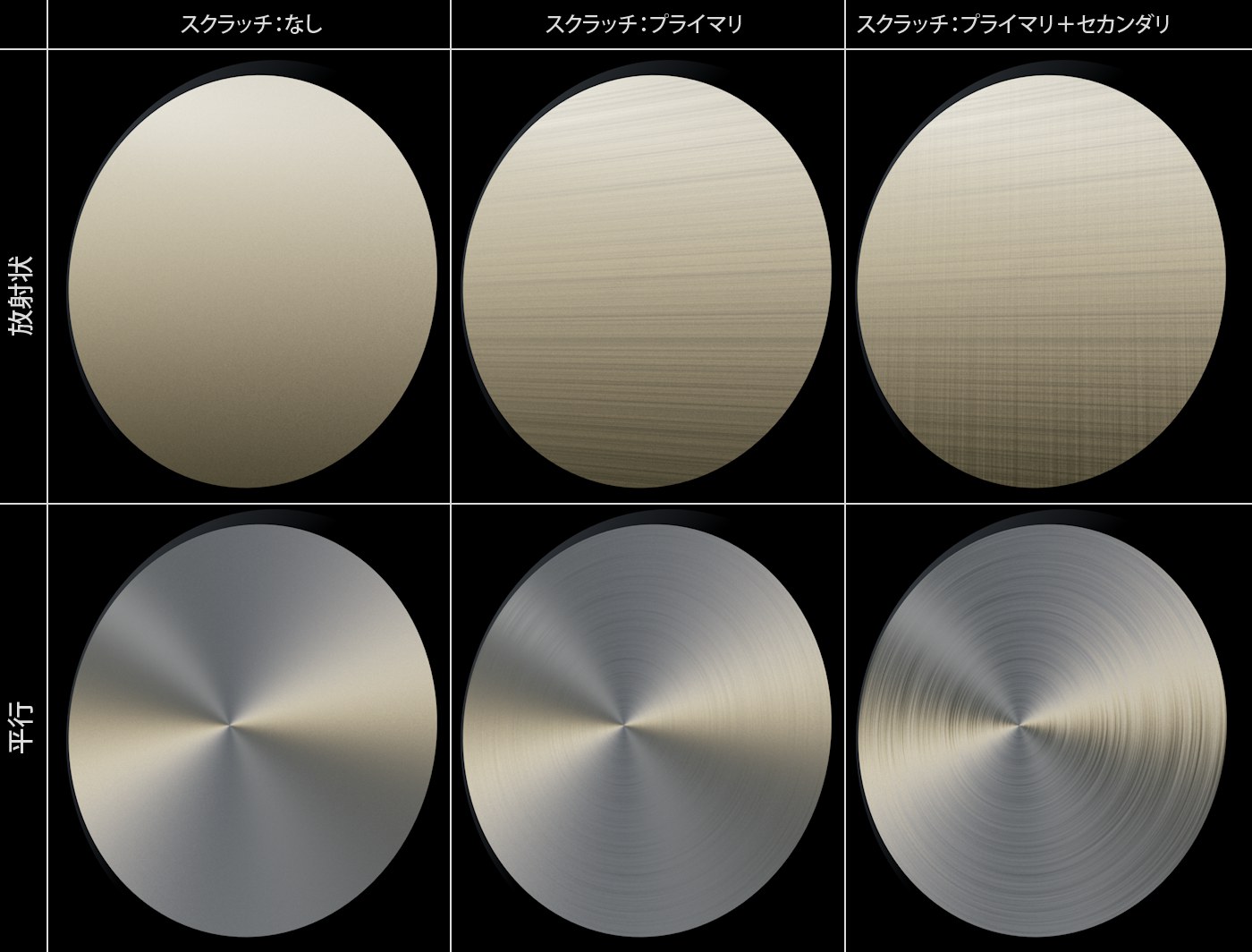 この設定を使うと、カーボン紙やブラシでこすったメタルなどの一般的な異方性マテリアルを作成することができます。さらに、テクスチャを使って、他の多くのパターンを作成することができます。