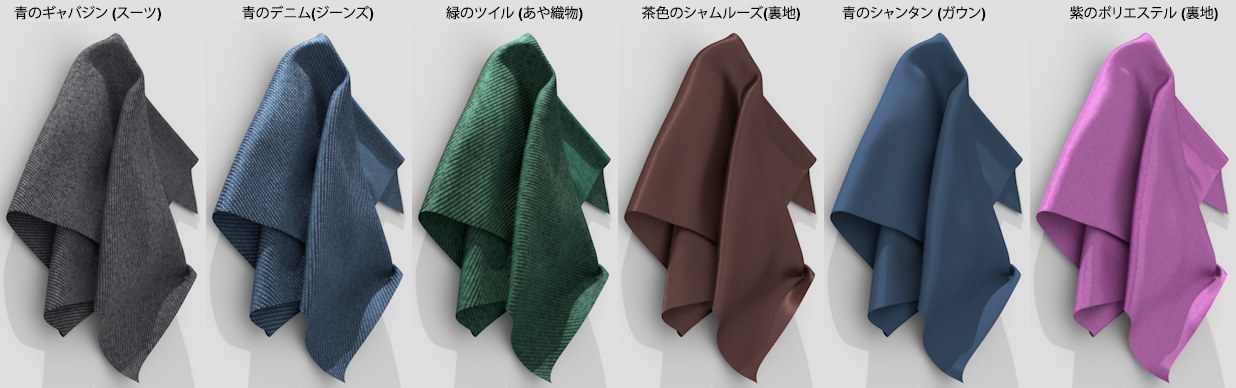 遠くから見ると、これらの構造は入り混じって特徴的な布を作っており、見る方向によって見え方が少しずつ異なります。実際の世界では異なる反射属性をもつ異なる糸で縦糸と横糸が作られていることを考えれば、これは驚くことではありません。ポリエステル: 例えば、ライニングは、光沢のあるエレメントが互いに垂直に置かれることによって構成され、強い反射属性をもっています(上の画像の一番右にあるように)。