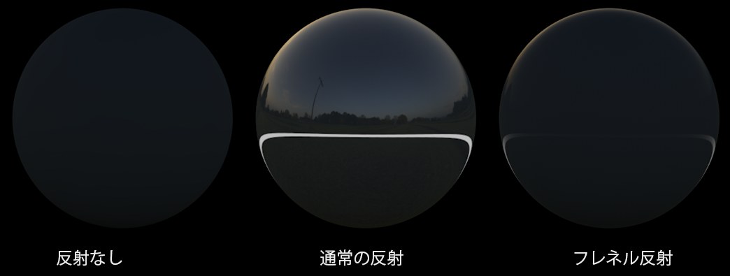 このオプションを有効にすると、フレネル鏡面反射を反転させることができます。例(球体上): 通常、球体の中心で生じる最大の反射がエッジの方に切り替わります。
