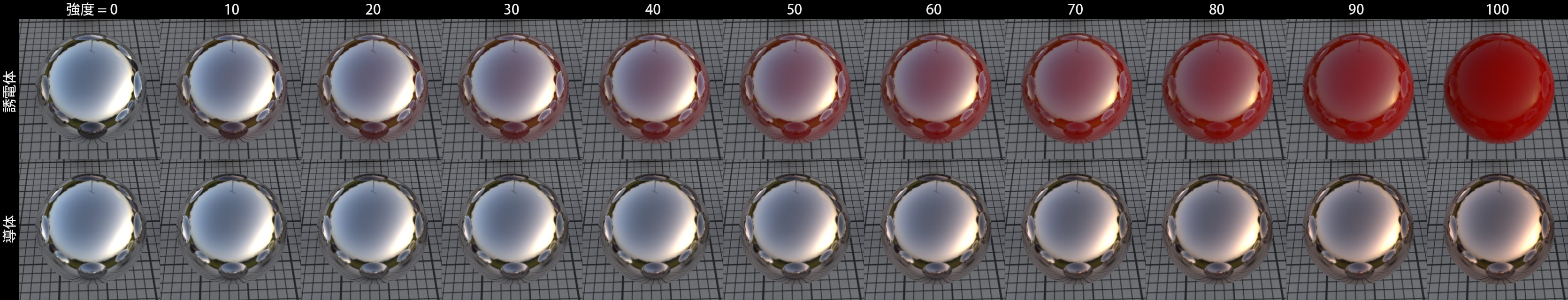 導体は同様に作用します(ただし、吸収値にも左右されるため、増加した屈折反射の増幅は線形ではありません。実物に近い結果を得るためにはプリセット値を使用することをお勧めします)が、一般に、反射はもっと目立ったものになります。
