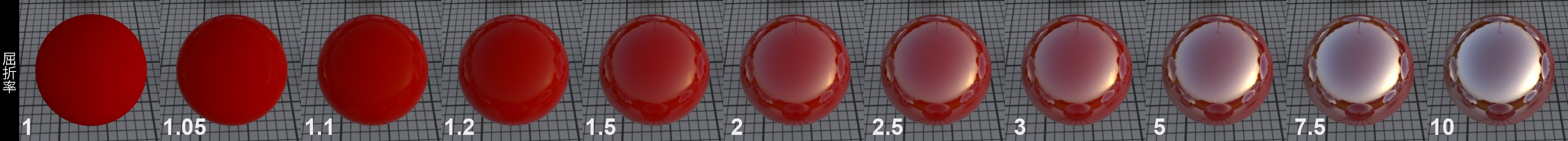 屈折率は、主に、ライトの屈折効果とともに言及されますが、マテリアルのライト反射の入射角度の測定のことでもあります(透明か不透明かにかかわらず)。上の画像から分かるように、値が小さいと、マテリアルの反射のほとんどが、カメラの視野角度がとても低い領域でのみ生じています。値を大きくすると、それに応じて反射が前面領域に移動しています。