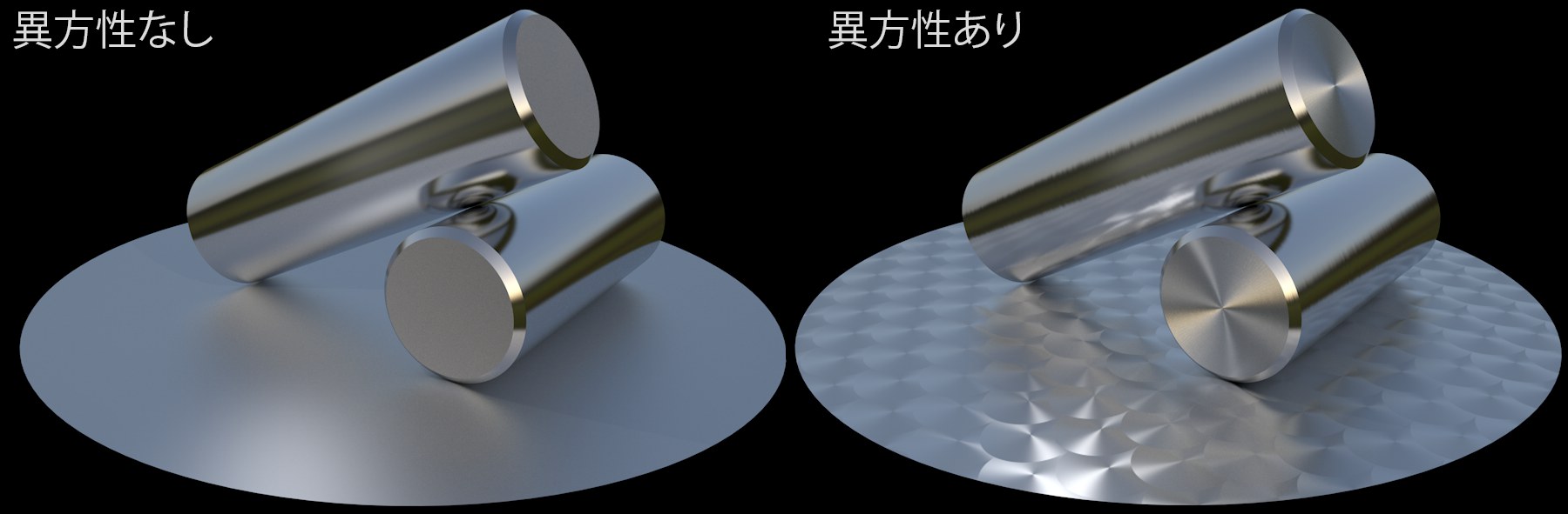 - 異方性は、反射した光線の束を特定の方向に曲げて、例えば、ブラシでこすった、または引っ掻いたメタルなどによる反射の歪みを作り出します。
