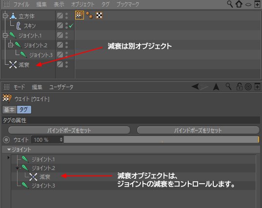 ここまでできたら、それぞれの減衰オブジェクトがそのジョイントの子として表示されるので、どのウェイト減衰がどのジョイントに割り当てられているかが容易にわかるようになります。