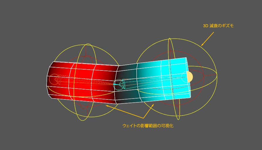 減衰オブジェクトのみを移動、回転するだけではメッシュは変形しないことを忘れないでください。ウェイト減衰はジョイントと結合しているため、メッシュの変形に実際に使うことができるのはジョイントだけです。減衰オブジェクトは、空間的な減衰機能であり、ジョイントの影響領域を指定するだけです。ジョイントから独立して移動することはできますが、その場合もジョイントの影響領域のみが変更されるだけです(すなわち、メッシュの頂点がジョイントに結合しているということです。減衰オブジェクトは、ジョイントのこれらのポイントがどの影響領域にあるかを定義します)。
