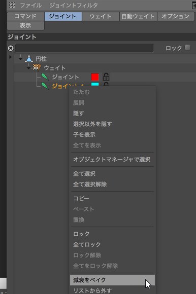 減衰オブジェクトも簡単にベイクできます。ウェイトマネージャを開き(Shiftを押しながらウェイトタグをダブルクリック)、ベイクするジョイントを選択し、ジョイントを右クリックして表示されるコンテキストメニュー の減衰をベイクコマンドをクリックします。このコマンドは、ウェイトタグで減衰オブジェクトを設定していないジョイントでは利用できません。