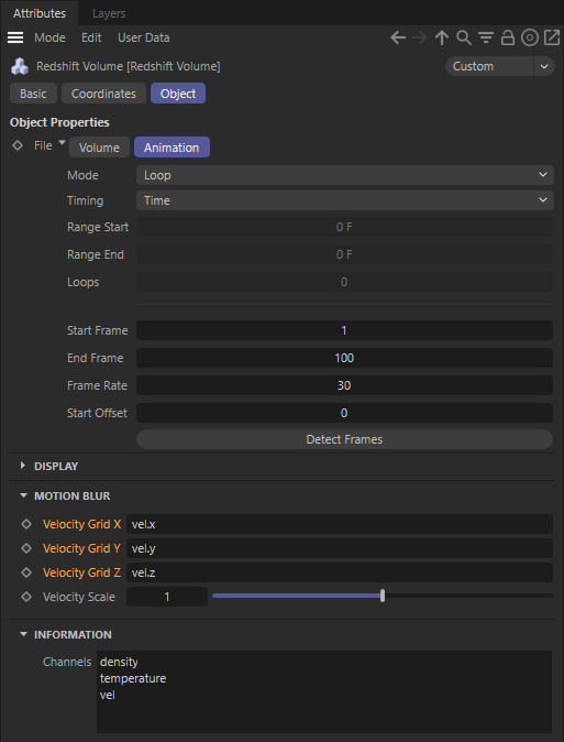To know the names of the Channels included in a loaded VDB file is key to configure the Redshift Volume Shader, therefore you will find all loaded channel names in the Information part of the Redshift Volume Object.