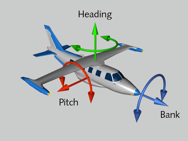 Diese Begriffe sind Ihnen vielleicht schon von Flugsimulatoren geläufig. Wenn ein Flugzeug nach rechts/links fliegt, ändert es den Heading-Winkel. Kippt es nach oben, z.B. beim Start, ändert es den Pitch-Winkel. Fliegt es eine Rolle, ändert es den Bank-Winkel.