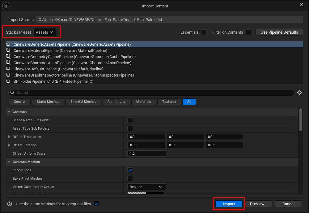 During the import, the desired pipeline stack can be selected (see red marking in the top left of the illustration). The default Assets stack is already correctly configured for loading Cinema 4D content by installing the Cineware Interchange components and can therefore be used unchanged. Otherwise, you can select your own stack here, to which you have manually added the previously discussed Cineware pipelines. Then confirm using the Import button (see marking at the bottom right of the illustration)