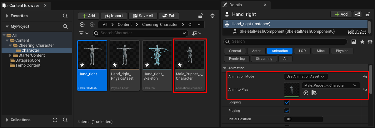 If the imported asset is an animated figure, for example, the SkeletalMesh component is the one that you place in the scene by dragging it into the Viewer (see blue highlighting on the left in the illustration). Then switch the Animation Mode for the SkeletalMeshActor of the rig to Use Animation Asset and assign the respective Animation Sequence under Anim to Play (see elements outlined in red in the illustration).