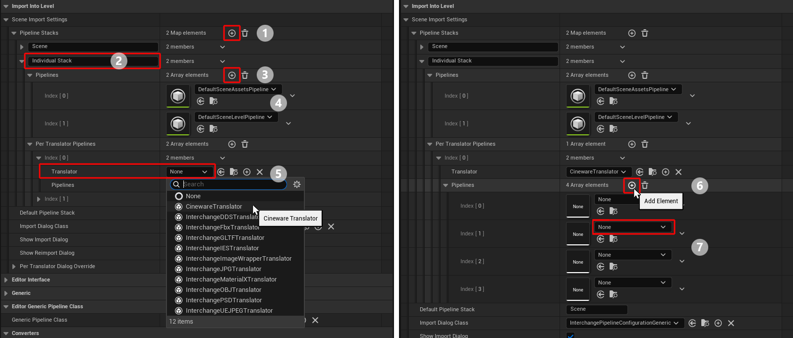 In the right-hand part of the dialog (see also the right-hand side of the figure above), you will find the group for the Scene Import Settings under Import Into Level. It contains the pipelines that are relevant to us. The Cineware for Unreal installation of the Interchange component automatically integrates all required pipeline stacks (see following figure).