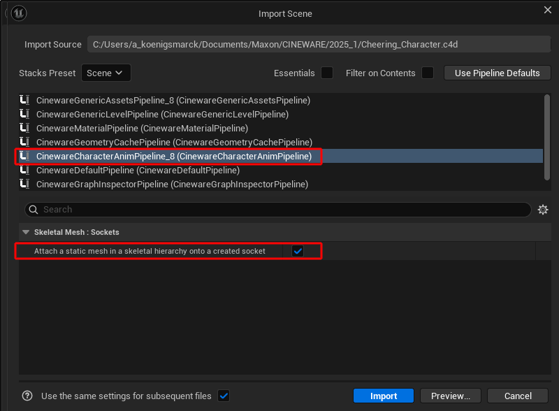 In such cases, activate the option for Attach a static mesh in a skeletal hierarchy onto a created socket during import, which is displayed after selecting the CinewareCharacterAnimPipeline (see following figure). The static meshes within the imported joint hierarchy are then automatically integrated within the rig at the corresponding position.