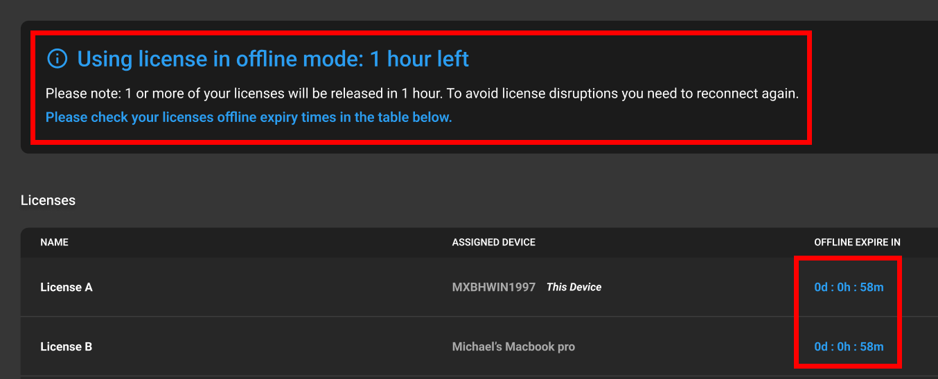 When you lose network connectivity, a banner appears alerting you that you're using your license(s) in offline mode. Within the Licenses table, you'll also see the amount of time each license has left to run in the offline state. If you're editing VFX in the solitude of the mid-Atlantic and only have a day left, maybe start paddling.