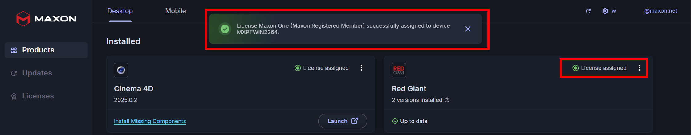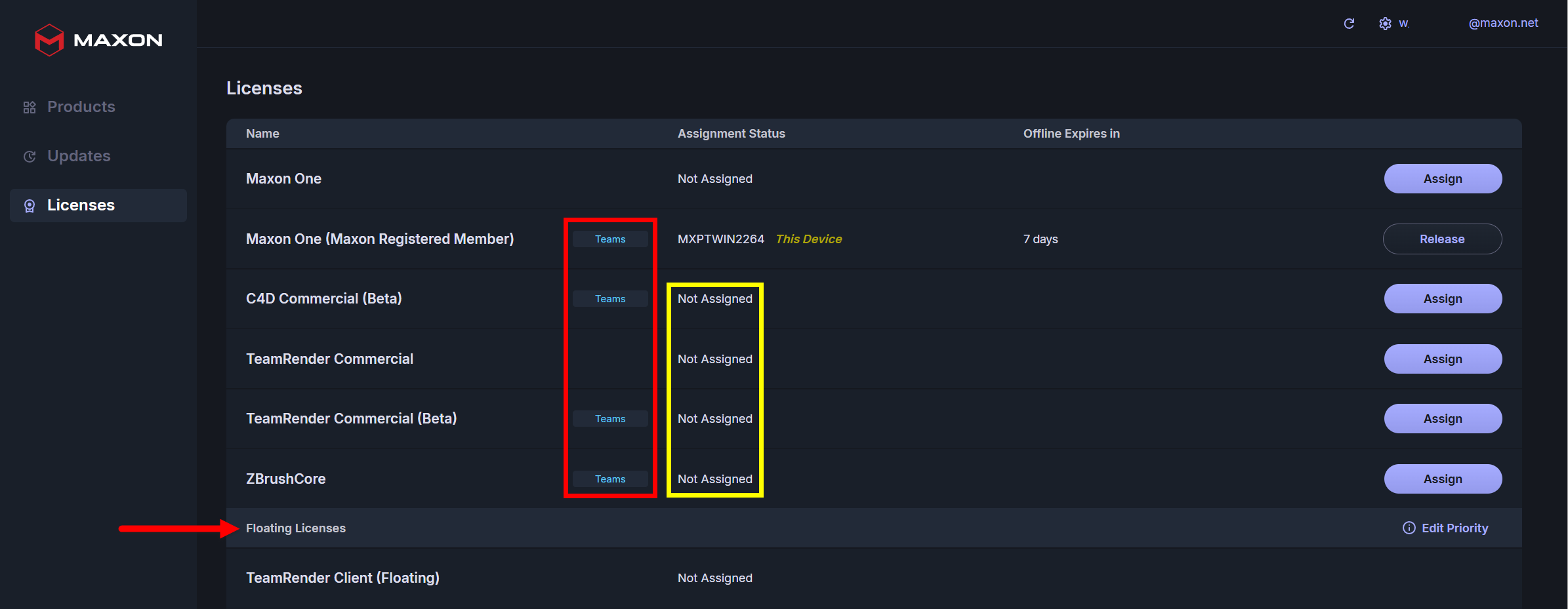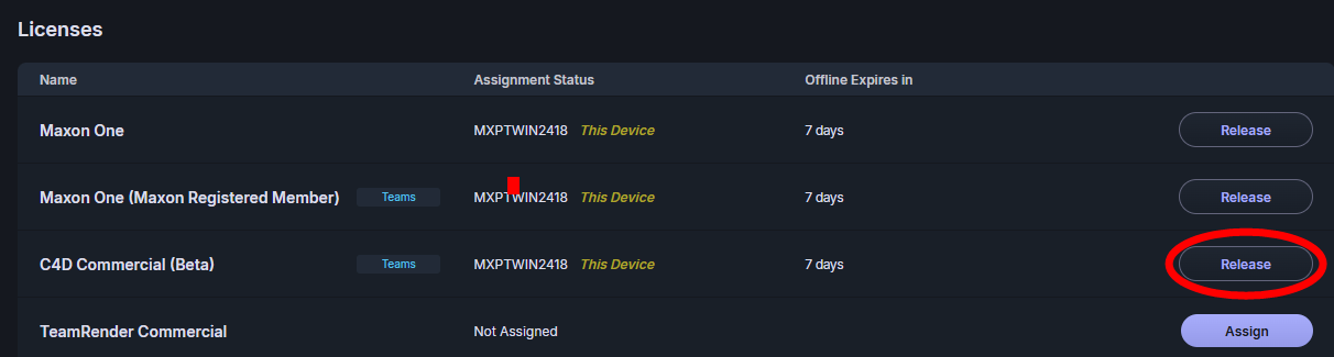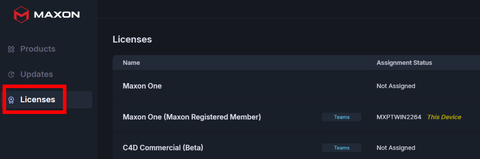 As you've seen elsewhere in this user guide, Maxon App supports a range of Maxon software licenses and tools for managing those licenses. Historically, license management has been done through the user portal at Maxon.net. (For example, you can find a full breakdown of the web-based Teams Dashboard here.) Today, this functionality and more can also be conveniently handled within the Maxon App via the Licenses tab.